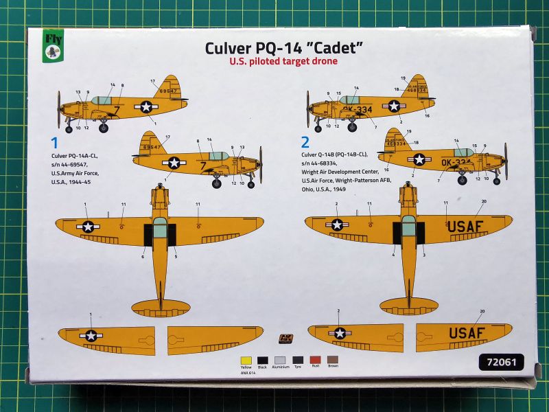 Model: Culver PQ-14 'Cadet' - U.S. Piloted Target Drone 'Yellow Wings', Producent: Fly, Nr kat.: 72061 Skala: 1:72 Tworzywo: model wtryskowy, maski, Malowanie: 2 x USA, |