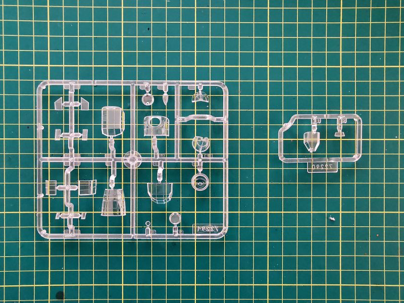 Oszklenie składa się z dwóch wyprasek. Pierwsza, większa to standardowa wypraska do wcześniejszych wersji, zaś wykorzystamy z niej jedynie okrągły element widoczny na zdjęciu po lewej z dołu. Wykorzystamy natomiast całą zawartość mniejszej wypraski, czyli składające się z dwóch elementów oszklenie „bunkra”. Doskonale widać, że niewiele będzie widać przez te małe okienka, pomimo dobrej przezroczystości elementów i ich dość cienkich ścianek.