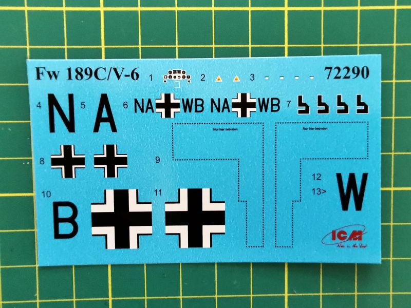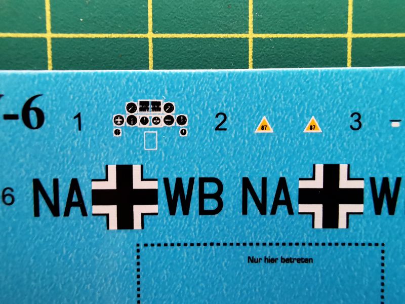 Kalkomania to niewielki arkusik, ale zawierający wszystko, co jest potrzebne wykonania miniatury prototypu V-6, oznaczenia, napisy eksploatacyjne oraz imitację zegarów na tablicę przyrządów. Jak widać na zdjęciach wszystko wydrukowano bez zarzutu, jedynie swastyki podzielono po przekątnej dla lepszej poprawności politycznej.