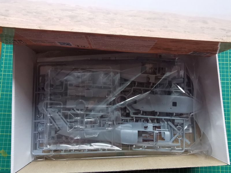 Zestaw zapakowano duże kartonowe pudło z lakierowanym wiekiem, czyli na dobrą sprawę nie zmieniło się nic, jedynie boxart przedstawiający śmigłowiec w locie nad jakąś pustynią może sugerować, że coś się zmieni. Że szata graficzna przyjmie bardziej minimalistyczną formę. To jednak tylko pozory, wszystko jest jak było. W środku znajdziemy foliową torebkę zawierającą w sumie siedem wyprasek z jasnoszarego polistyrenu i jedną przezroczystą. Do tego dochodzi arkusz kalkomanii oraz instrukcja.