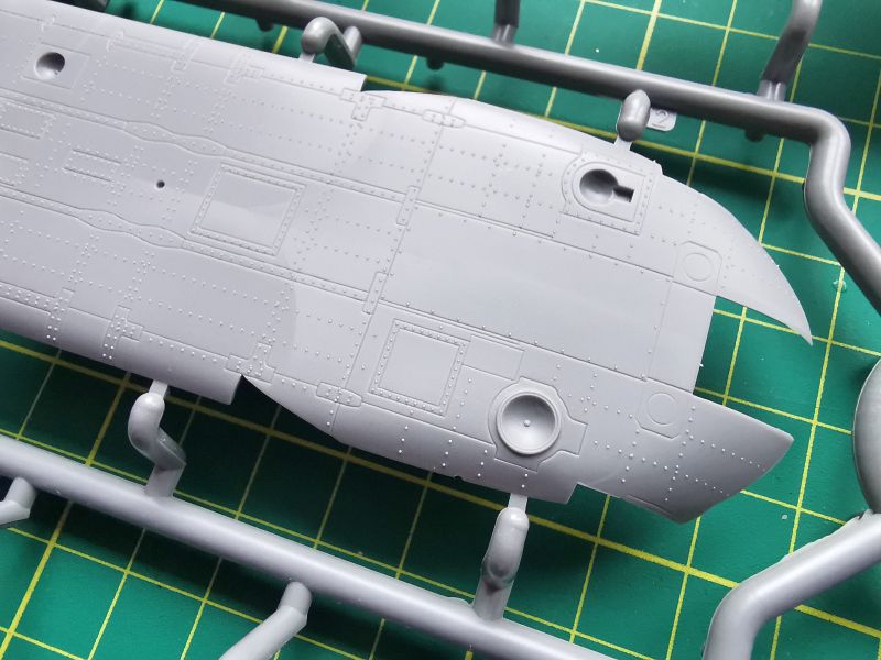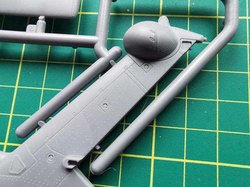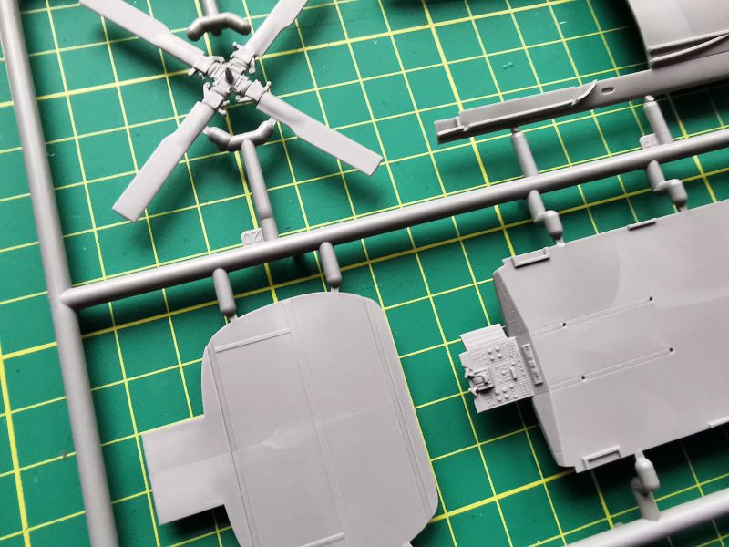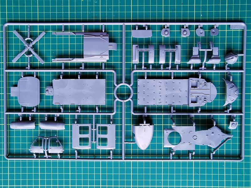 Model został opracowany w dość podobnej konwencji jak inne wcześniej wydane modele śmigłowców, takie jak Cobra czy CH-54A, niezależnie od podziałki. Producent w niemal misterny sposób wykonał fakturę powierzchni z delikatnymi, wgłębnymi liniami podziału oraz równie delikatnymi wypukłymi nitami. Tak właśnie wygląda kadłub, który wraz ze statecznikiem poziomym znajduje się na wyprasce oznaczonej jako „A”. Kadłub składa się z połówek prawej i lewej oraz podłogi. W nim zabudujemy kokpit, przedział desantu, zaś nad tym zamontujemy górę kadłuba wraz z wirnikiem. Na końcu zaś wspomnianą przeze mnie podłogę.
