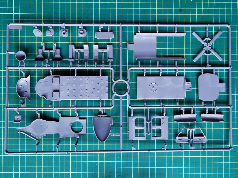 Kolejna ramka, czyli „B” zawiera dalsze elementy kadłuba i jego wnętrza. Znajdziemy tam także trochę detali silnika oraz wirnik ogonowy. Producent dużo uwagi poświęcił nie tylko zewnętrznym powierzchniom modelu, ale także detalom wnętrza. Będzie ono doskonale widoczne, nie tylko przez bogate oszklenie, ale także przez drzwi, w wszystkie maną opcję wykonania ich w pozycji otwartej.