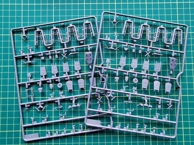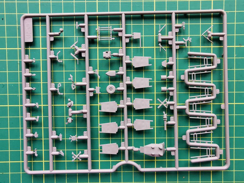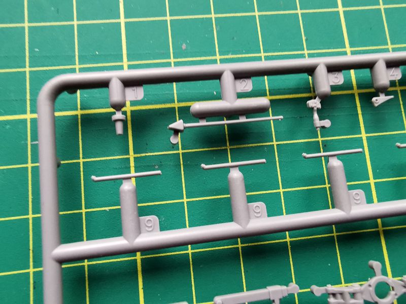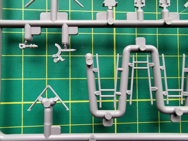 Tego typu elementy znalazły się na dwóch mniejszych wypraskach, przy czym też nie ma tu wyraźnego rozgraniczenia na ich przeznaczenie, na miejsce ich zamontowania. Na ramce „D” znajdziemy zarówno detale wnętrza, jak i różne drobiazgi na zamontowania na zewnątrz kadłuba…