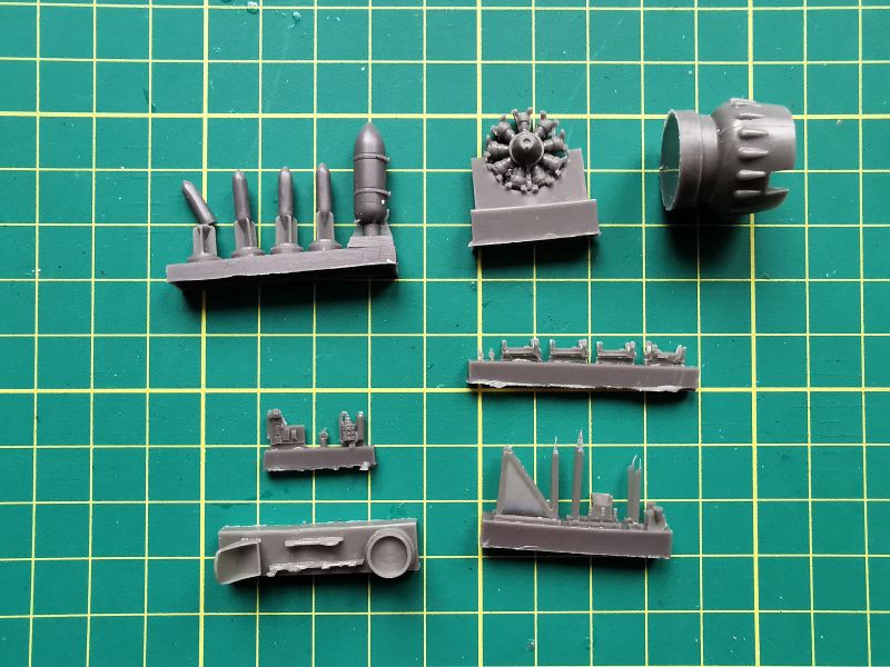 Mamy zatem silnik wraz z osłoną, bomby wraz z wyrzutnikami, wyposażenie kabiny pilota oraz spora ilość detali zewnętrznych takich jak zastrzały, lufy karabinów maszynowych i temu podobnych drobiazgów. Nie jest to może szczyt możliwości tej technologii, bo widziałem odlewy wykonane lepiej, bardziej precyzyjnie, ale te także nadają się do wykorzystania i będą się dobrze prezentować po odpowiedniej obróbce i pomalowaniu.