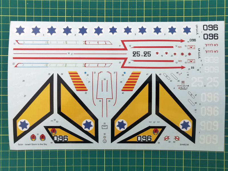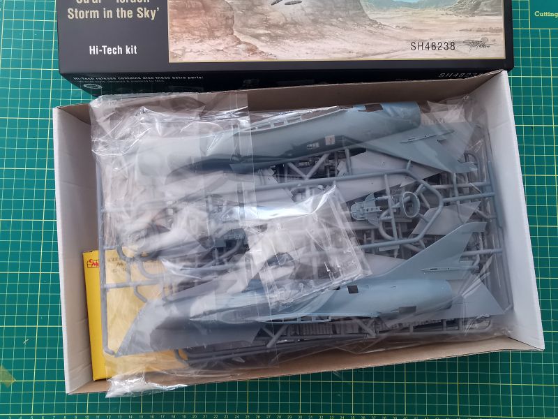 Czarne wieko o charakterystycznej szacie graficznej od razu wskazuje nam, że jest to zestaw „Hi-Tech kit”, czyli zawierający znacznie większą niż w przypadku standardowo wydawanych zestawów liczbę dodatków. Przy czym w przypadku omawianego zestawu nie tylko dodatki są tu rozbudowane, większa jest także liczba ramek wtryskowych, ale o tym za chwilę. Pudełko zdobi boxart znany z jednego z wydanych wcześniej modeli tego samolotu w podziałce 1/72. Taki sam jest także tytuł zestawu – „Sa’ar – Israeli Storm in the Sky”. Tematyka konfliktów zbrojnych na Bliskim Wschodzie jest bardzo popularna wśród modelarzy, jednak podjęcie tej akurat tematyki przy coraz bardziej dramatycznych relacjach medialnych ze Strefy Gazy może wzbudzać kontrowersje. Zresztą bardzo słusznie. Postępowanie obu stron tego konfliktu zasługuje na potępienie przez społeczność międzynarodową i tak się zresztą dzieje. Nic nie usprawiedliwia ataku z dnia 7 października 2023 r. i tego co stało się później i trwa do tej pory. Jest to ludobójstwo i zbrodnie wojenne, za które odpowiadają obie strony, zaś osoby które się tego dopuściły muszą ponieść odpowiedzialność za swoje czyny. Jak widać także recenzja modelu może być dobrą okazją do zwrócenia uwagi na tematy trudne i wrażliwe. Z przyczyn wskazanych powyżej postanowiłem także ograniczyć do niezbędnego minimum omówienie proponowanych przez producenta schematów malowania. Teraz już skupię się na przedstawianiu nowego zestawu Special Hobby, a jest o czym pisać. W pudełku znajdujemy sporą foliową torbę z wypraskami, pudełko w którym znajdują się dodatki. Uzupełnieniem jest spory arkusz kalkomanii oraz maski do malowania. Model Super Mystère wydanego przez Azur Frrom składał się z pięciu wyprasek wykonanych z jasnoszarego tworzywa i jednej przezroczystej. Special Hobby raczy nas zestawem składającym się aż z ośmiu ramek i jednej przezroczystej i sporą ilością dodatków wykonanych metodą wydruku 3D. Sprawia to, że pudełko, przecież słusznych rozmiarów jest wypchane po brzegi i na ewentualne dodatkowe artefakty nie zostało sporo miejsca. Pierwsze, co rzuca się w oczy to kolor tworzywa użytego do produkcji wyprasek. Część z nich, to można powiedzieć, klasyczne Special Hobby, ale część wykonano z tworzywa o barwie szaro – niebieskiej, charakterystycznego dla produktów Eduarda. Nie od dzisiaj wiadomo, że obie firmy dość ściśle współpracują ze sobą.