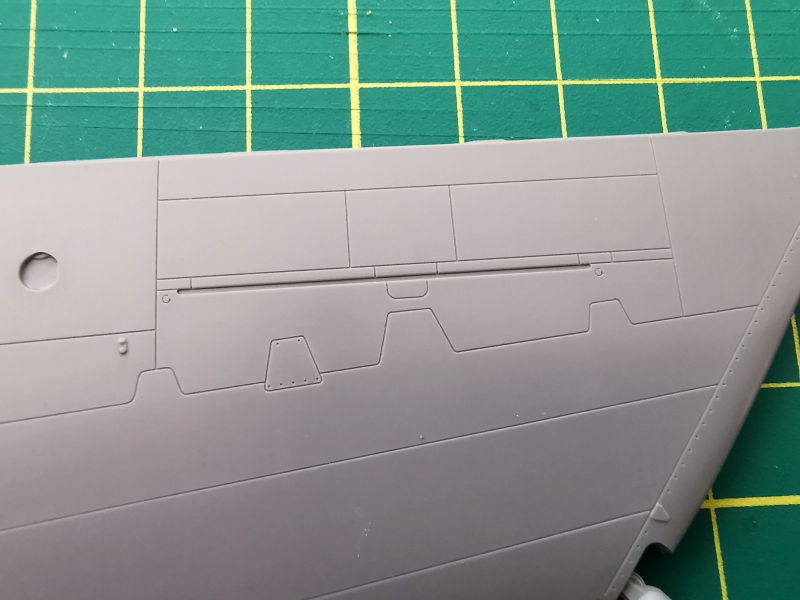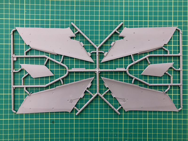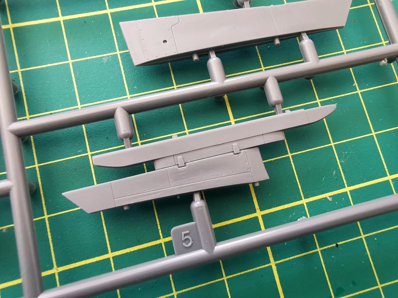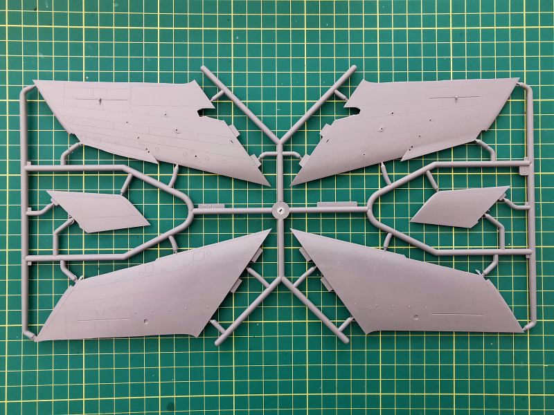 Skrzydła umieszczone na ramce „B” mają klasyczny podział i konstrukcję. Lotki i klapy wykonano jako integralne elementy, jak komuś marzą się klapy otwarte, konieczne będą samodzielne przeróbki, chyba że za jakiś czas pojawią się zestawy do waloryzacji. Faktura powierzchni wykonana tak samo jak na kadłubie. Ja osobiście zastrzeżeń nie zgłaszam.