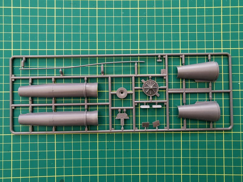 Ramka „F” to jedna z tych ramek, których nie było w tym modelu w wydaniu Azur Frrom. Zawiera tylną część kadłuba, odpowiednią dyszę silnika, tablicę przyrządów oraz kilka innych elementów, które na pewno się nam przydadzą, w instrukcji żaden nie został przekreślony na czerwono. Tablica przyrządów także przykuła moja uwagę ładnie wykonaną fakturą. Swoją drogą jestem ciekaw jak będzie się na niej kłaść kalkomania wykonana nową metodą firmy Eduard. Co ciekawe zaznaczono na niej puszki zegarów i z tego, co zdążyłem się zorientować, będą one widoczne z przodu. Trzeba będzie dołożyć trochę przewodów.