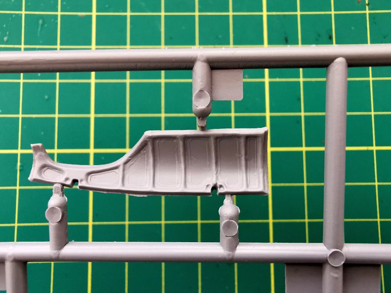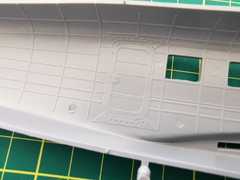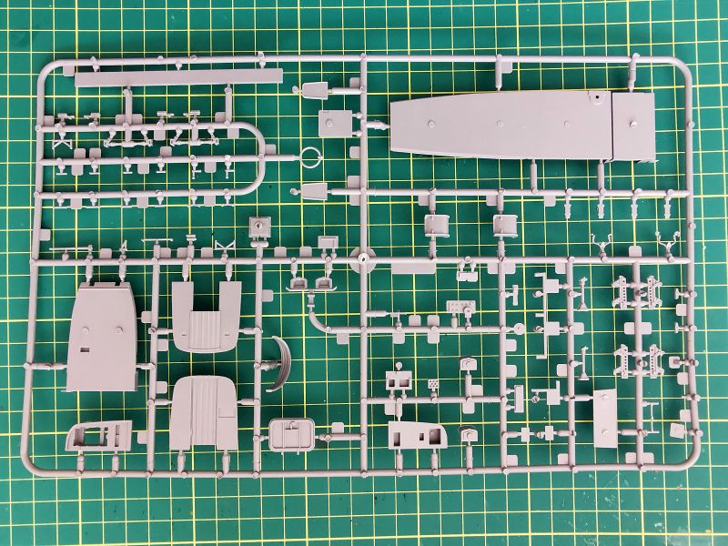 Na ramce „A” znajdują się połówki kadłuba oraz trochę detali wnętrza. Trudno jest mi stwierdzić, czy model został opracowany cyfrowo, czy w sposób klasyczny, co jest bardziej prawdopodobne, biorąc pod uwagę datę wydania pierwszego zestawu. Jednak to, co zobaczyłem nastroiło mnie pozytywnie do tego zestawu. Delikatne i równe linie podziału, w niektórych miejscach także nity i kapitalna faktura wnętrza kadłuba, która jednak nam może zginąć pod ciemnoszarym kolorem wnętrza. Możemy wykonać drzwi wejściowe w pozycji otwartej, ale w tym celu musimy wyciąć otwór w kadłubie.