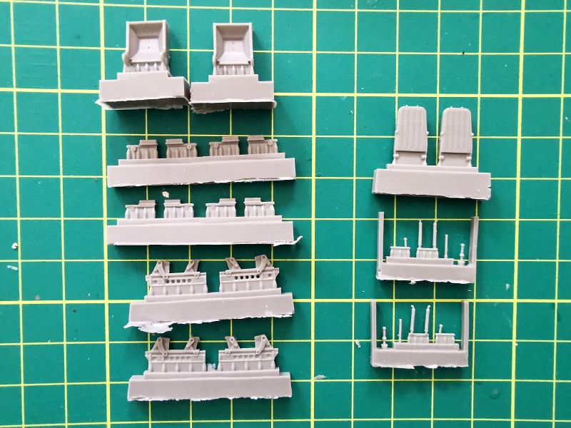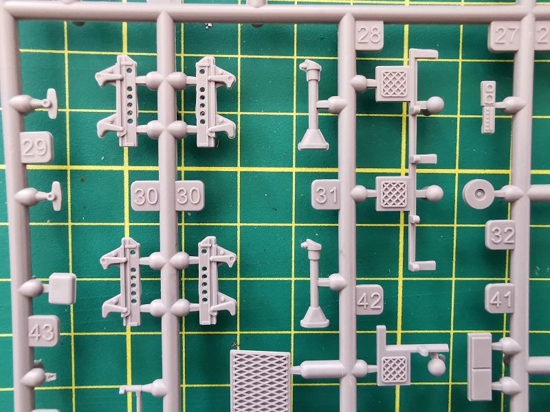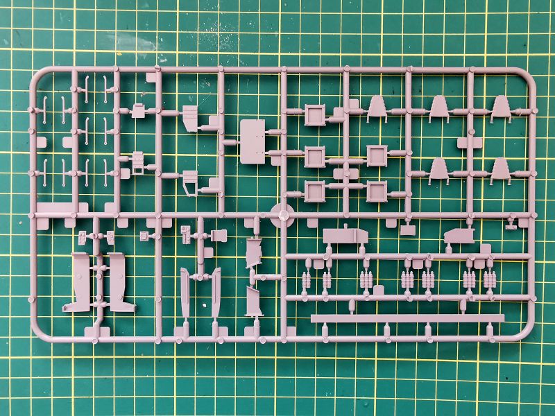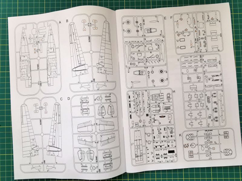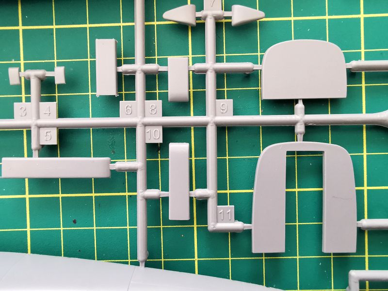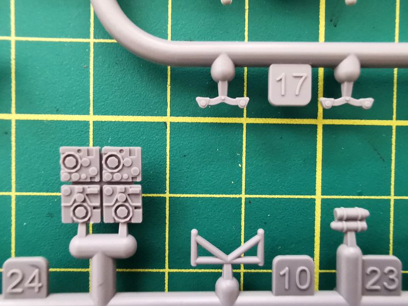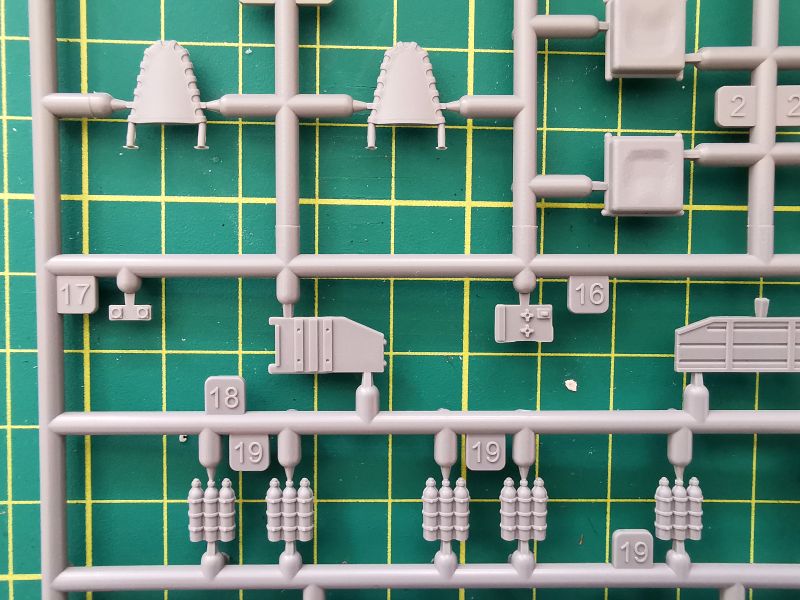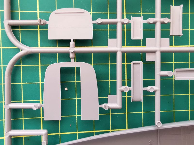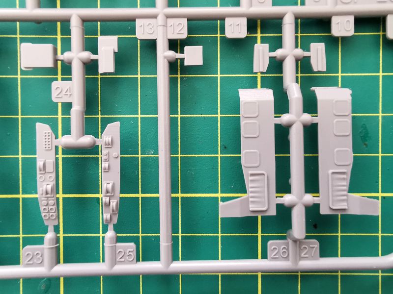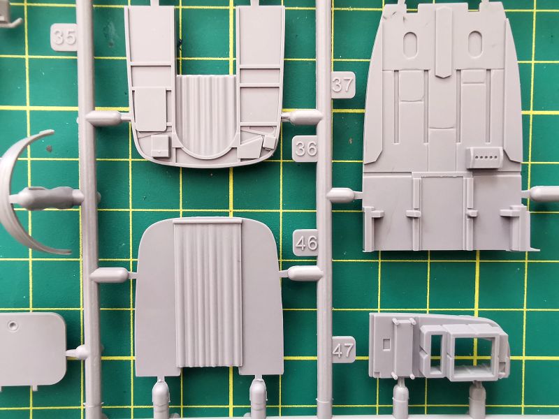 Dwie kolejne ramki wykonano z tworzywa o nieco innym odcieniu niż reszta. Pierwsza, większa oznaczona jako „F” zawiera cały szereg drobnych detali podwozia silników oraz drzwi wejściowe. Aż żal ich nie wykorzystać. Ramka „G” to elementy śmigieł dla odmiany francuskiej.