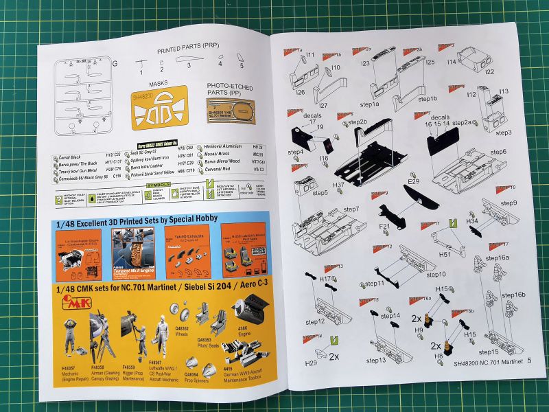 Jest to kolorowa, wydana na popierze kredowym broszura, w której znajdziemy wszystko, zarówno rys historyczny samolotu, czytelne rysunki montażowe oraz materiały reklamowe, promujące inne wyroby producenta a także firmy CMK. Co do tego ostatniego, w instrukcji znajdziemy także swoistą „listę zakupów” czyli wykaz dodatków oferowanych przez CMK właśnie do naszego modelu. Część z nich przedstawię poniżej.