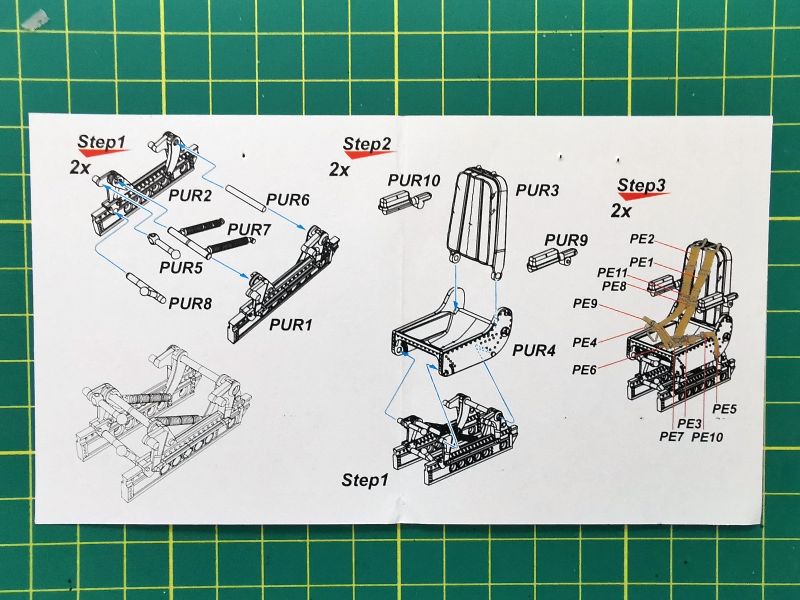 Jest tu wszystko, co jest potrzebne do wykonania foteli pilotów, zresztą nie tylko foteli ale także ich ram mechanizmem regulacji. Co ważne, na blaszce znajdują się pasy. Jeżeli chcemy wyposażyć w pasy także fotele w kabinie pasażerskiej, musimy sięgnąć po jakiś inny zestaw, lub wykonać je od podstaw.