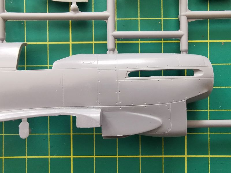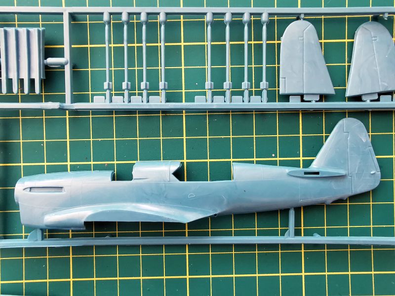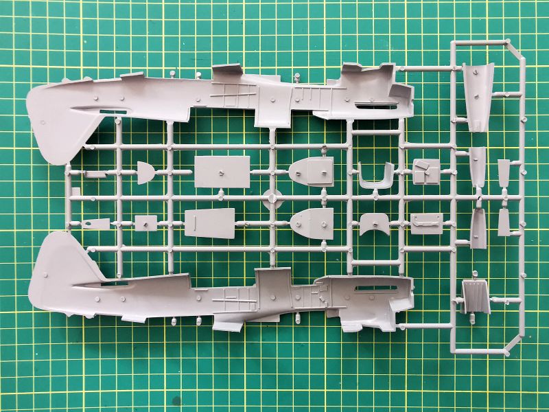 W podobny sposób powstała kolejna ramka, na której znajdują się większość podzespołów kadłuba. Ma on także klasyczny podział na prawą i lewą połówkę. Znajdziemy tam także trochę detali wnętrza kabiny, wlotu powietrza do chłodnicy i temu podobnych rzeczy. Zewnętrzna faktura kadłuba prezentuje się podobnie jak skrzydła. Wklęsłe, równe i wyraźne linie podziału blach, nie przekombinowane w żadną stronę powierzchnie kryte płótnem. Dopiero, gdy zajrzymy do wewnątrz, od razu przypominamy sobie z jaką technologią mamy do czynienia. Dość chropowata powierzchnia, sporo śladów po wypychaczach, na szczęście usunąć należy jedynie te z kabiny pilota, ale bezwzględnie trzeba to zrobić. Na burtach zaznaczono jedynie imitację konstrukcji kadłuba.