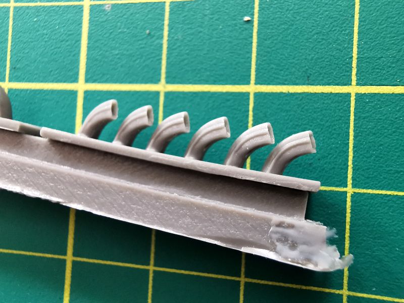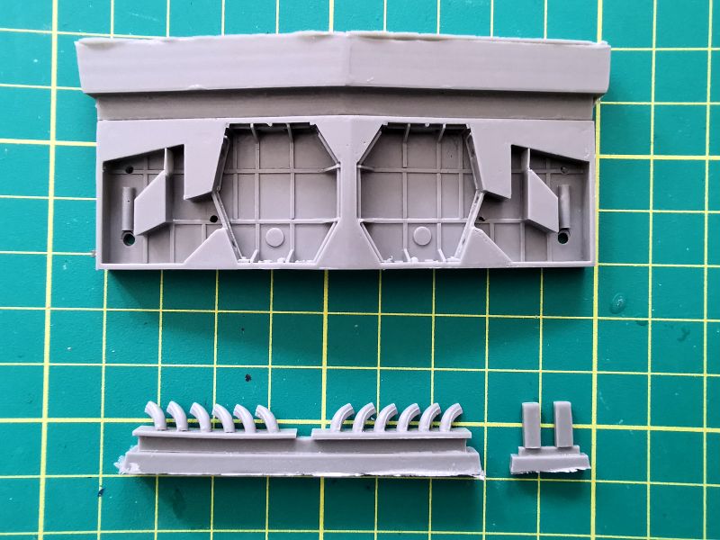 Ponieważ model jest short runem, elementy polistyrenowe zostały uzupełnione o fototrawione i żywiczne dodatki. Na blaszce umieszczono jedynie dwa elementy, są to podstawy wyrzutni niekierowanych pocisków rakietowych. Przykleimy je do dolnych powierzchni skrzydeł. Jako odlewy żywiczne wykonano luki podwozia, kolektory spalin oraz wloty powietrza, nie wiem co prawda do czego, ale podejrzewam że do gaźnika, sądząc po ich umiejscowieniu. Lukom podwozia można zaaplikować kilka kabli i podobnych bajerów, jak ktoś posiada dokumentację. Rury wydechowe wymagają jedynie poprawnego pomalowania i kilku zabiegów artystycznych.