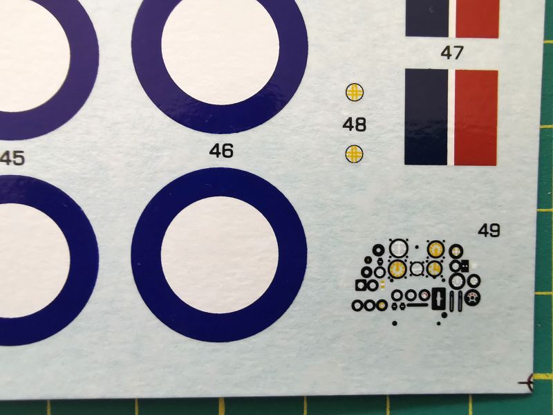 Kalkomanie. Producent zaopatrzył zestaw w aż dwa spore arkusze. Na pierwszym z nich znajdziemy oznaczenia i stencile, zaś na drugim same czarne oznaczenia literowo – cyfrowe. Każdy z samolotów miał tego dość sporo i to słusznych rozmiarów, więc rozmiar arkusików nie powinien dziwić. Pod względem kolorystyki i jakości druku kalkomanie wyglądają poprawnie. Kalkomanie drukowała firma Aviprint, która kiedyś świadczyła tego typu usługi na rzecz Special Hobby. Nakładamy je zatem w klasyczny sposób.