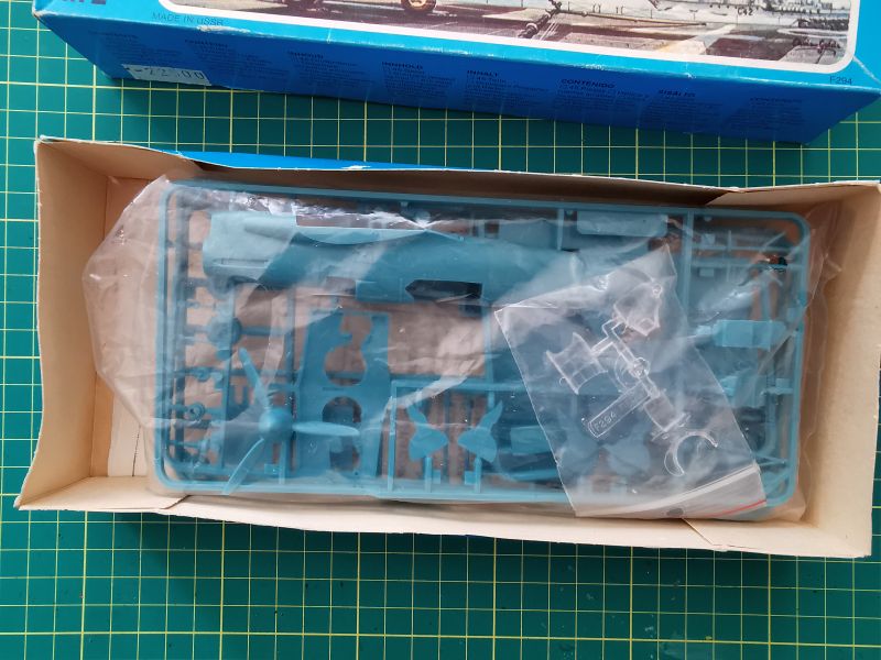 Jak widać na zdjęciach, model składa się z czterech wyprasek wykonanych z błękitnego polistyrenu. Kolor ten nie był normą, po prostu wytryskiwano to co akurat było. Wypraski mogły być także białe, szare, zielone, żółte a nawet czerwone i chyba nie wyczerpałem całej palety kolorów. Linie podziału w modelu są poprowadzone poprawnie, są jednak wypukłe, co w owych czasach było normą. Hasegawa jeszcze nie wpadła na swój najbardziej znany patent. Kokpit to właściwie tylko fotele i figurki pilotów, o szczegółach luków podwozia też można było zapomnieć. Oszklenie o grubych ściankach i mało przejrzyste. Stąd właśnie wzięło się określenie „kuflowe”.