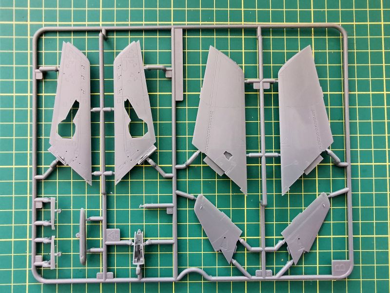 Po wewnętrznej stronie górnych połówek skrzydeł znajdują się miejsca, gdzie należy je wkleić, z całkiem ładnie wykonaną fakturą. Podzespoły skrzydeł znajdują się na kolejnej ramce i mają klasyczny podział, nie mają wyodrębnionych jako osobnych elementów klap oraz lotek. Nie zmienia to jednak faktu, że są opracowane równie finezyjnie jak kadłub i inne detale znajdujące się na ramce wraz z nim. Baczny obserwator zwróci pewnie uwagę na dwa rodzaje usterzenia pionowego. Nie są to jednak dwie połówki, które należy z sobą połączyć, ale dwa osobne elementy, które wykorzystamy w zależności od wyboru wersji malowania. Świadczy to także o odejściu od klasycznego projektowania i wykonywania forma na rzecz technologii cyfrowej.