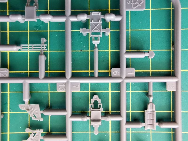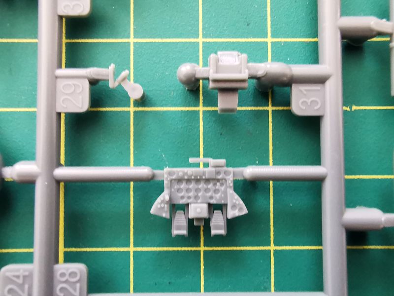 Następna ramka to wszelkie możliwe drobne detale, które wykorzystamy w pracach nad kokpitem podwoziem oraz w jeszcze innych miejscach. W sumie kilkadziesiąt precyzyjnie wykonanych elementów, z których pominiemy niekierowane pociski rakietowe oraz dwa warianty foteli wyrzucanych, w zestawie są ich trzy.