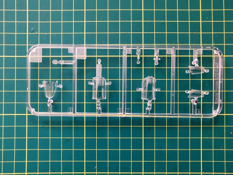 Oszklenie zwyczajowo uzupełnia podstawowe elementy zestawu. Jest to znaczenie mniejsza wypraska, na której znajdziemy dzieloną osłonę kabiny pilota, szybę celownika, reflektor do lądowania oraz klosz lampy pozycyjnej umieszczonej w napływie statecznika pionowego.