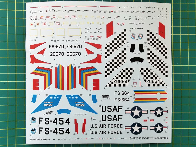 Ponieważ zestaw nie ma dodatków w postaci blaszek, żywic czy ostatnio coraz bardziej popularnych wydruków 3D przejdę od razu do omawiania kalkomanii. Jak widać jest to dość spory arkusz, którego nie powstydziłby się nie jeden model w skali 1/48.