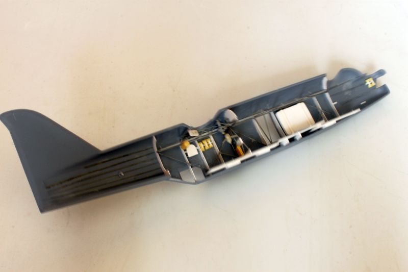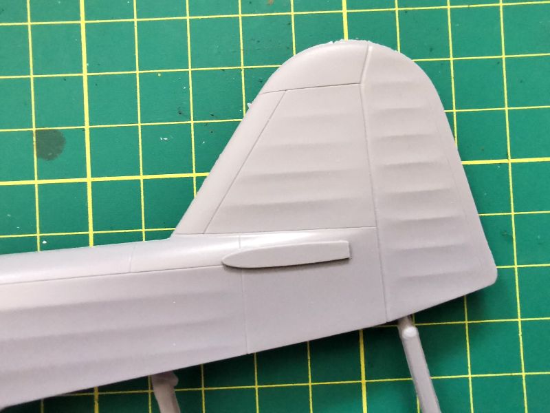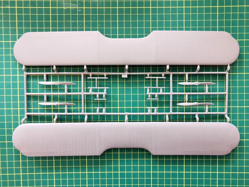 Dwie kolejne wypraski to płaty, usterzenie jeszcze trochę zastrzałów oraz śmigła. Płaty mają klasyczny podział, powierzchnie sterowe nie są wykonane oddzielnie, zaś opłótnienie jest wykonane w identyczny sposób, jak na kadłubie. Śmigłom i zastrzałom (wszystkim zresztą) przyda się zawarcie nieco bliższej znajomości z gąbkami ściernymi.