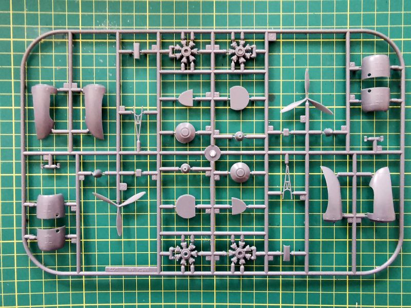 Podobnie rzecz wygląda z tym co zwykło się określać „kapsułami mocy” czyli zespołami śmigło – silnik – gondola, które znajdują się na kolejnej z ramek. Podział technologiczny to klasyka gatunku, ale z całkiem ładnie wykonanymi detalami, przynajmniej tymi na zewnątrz. Trochę pracy będą wymagały komory podwozia głównego. Po pierwsze musimy z nich usunąć ślady po wypychaczach i odtworzyć ich konstrukcję wewnętrzną. Całkiem dobrze prezentują się natomiast makiety silników. Wystarczy dokleić jakieś imitacje przewodów i będzie naprawdę super.