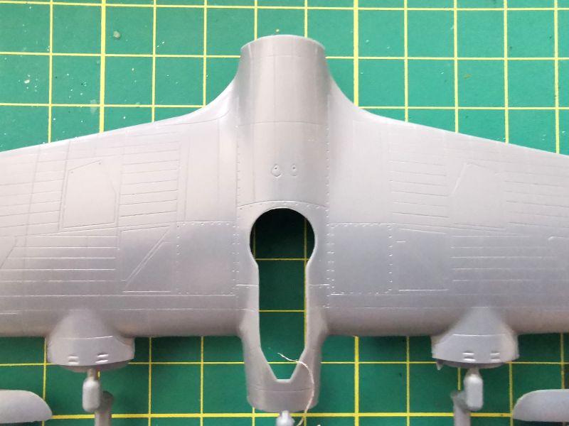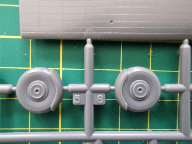 Kolejna, trzecia ramka to skrzydła, koła i pokrywy luków komór podwozia głównego. Są tam także golenie podwozia. Osobiście do gustu przypadła mi faktura powierzchni skrzydeł, przy czym same skrzydła a właściwie ich górna część, jako że samolot miał układ górnopłata, stanowi jeden element z przednią częścią kadłuba. Linie podziału wykonane w podobny sposób jak na kadłubie, dochodzą do tego gdzie niegdzie nity. Też mi się to podoba. Dysponujemy dwoma rodzajami kół podwozia głównego – z błotnikami i bez . W przypadku wyboru tych pierwszych czeka nas więcej gimnastyki przy malowaniu. Także warto rozważyć popracowanie nad pokrywami luków podwozia i goleniami. Ta ostatnia uwaga to tylko teoretyzowanie, bo sam osobiście nie znam za bardzo tego samolotu i szczegółów jego konstrukcji. Potrzebna będzie stosowna dokumentacja.