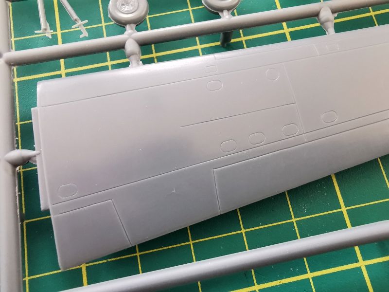 Druga wypraska to skrzydła i gondole silników. Jeśli chodzi o sposób wykonania linii podziału, to nie mam uwag, są wykonane tak samo, jak na kadłubie. Zdziwił mnie natomiast sposób zaprojektowania skrzydeł. Z doklejonymi osobno końcówkami. Linia podziału przypada mniej więcej w jednej trzeciej rozpiętości lotki. Może to nam utrudnić obróbkę miejsc łączenia klejonych elementów, no i trasowanie nowych linii podziału. Uważać też trzeba będzie na fakturę lotek. Jest wypukła. Poza elementami o których wspomniałem, na tej wyprasce znajdują się także golenie i koła podwozia głównego. Wykonane zupełnie przyzwoicie, biorąc pod uwagę technologię i czas ich powstania.