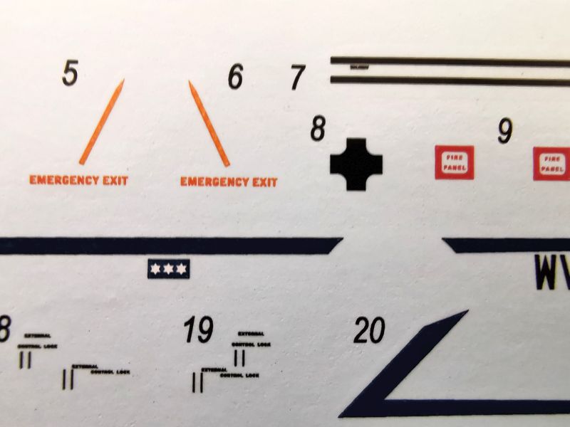 Kalkomania to dość spory arkusz, co wynika z wielkości samego modelu, jak i obecności dużych graficznych elementów w postaci pasów na kadłubie, godeł czy znaków rozpoznawczych i numerów. Do tego dochodzi całkiem pokaźna liczba stencili. Producent nie podaje, któte kalkomanie wydrukował, ale głównym podejrzanym jest tu Eduard.