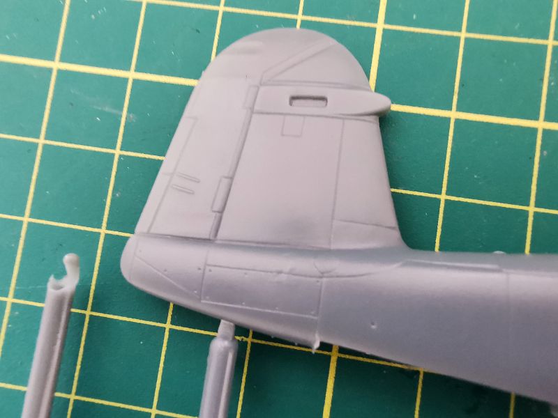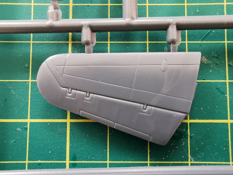 Kolejna wypraska to skrzydła, usterzenie oraz pokrywy lików podwozia. Jeśli chodzi o linie podziału i odtworzenie faktury powierzchni na skrzydłach, to wykonano ją podobnie jak na kadłubie. Ja nie mam zastrzeżeń, podobnie jak do odtworzenia imitacji powierzchni krytych płótnem. W przypadku tego modelu, są to tylko powierzchnie sterowe i lotki. Wykonano je jako integralne elementy skrzydeł i usterzenia. Jedynie klapy są oddzielnymi elementami, ale to wynika z konstrukcji samolotu. Inaczej się tego zaprojektować po prostu nie da. Jeśli ktoś chce mieć lotki i stery powychylane, musi się trochę potrudzić. Co więcej, jest możliwe samodzielne wykonanie skrzydeł złożonych w pozycji do hangarowania, ale to wymaga wielu godzin żmudnej pracy i nie jest to zajęcie dla kogoś kto dostaje histerii gdy ma obciąć nadlewkę, lub przeszlifować niezbyt równą krawędź jakiegoś elementu.