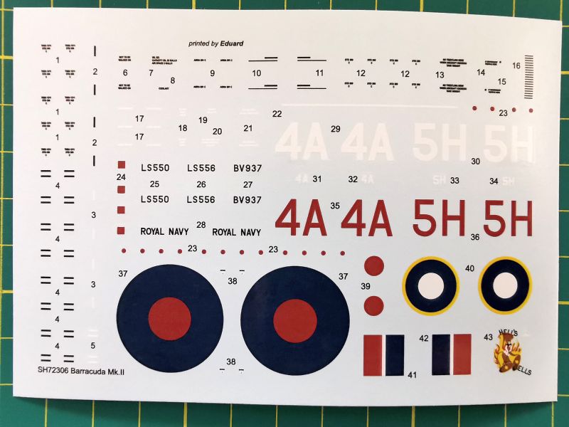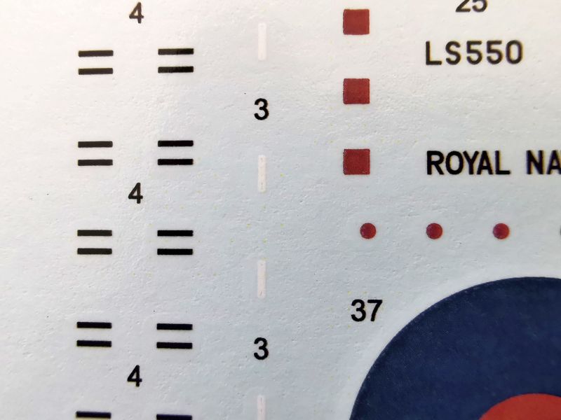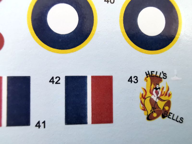 W zestawie nie ma blaszek, ani żywic, jest za to średniej wielkości arkusik z kalkomaniami. Na nim zaś brytyjskie oznaczenia, litery kodowe, jedno godło i dość duża ilość napisów eksploatacyjnych. Nie dopatrzyłem się błędów drukarskich w postaci na przykład nie prawidłowej kolorystyki czy przesunięć druku, ale nalazłem informację, że wydrukowała je firma Eduard. Jest to o tyle ważne, że po dokładnym wyschnięciu należy usunąć błonę z kalkomanii. Dopiero wtedy można myśleć jakiś waschach czy werniksie.