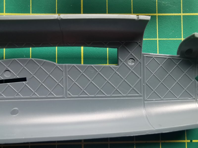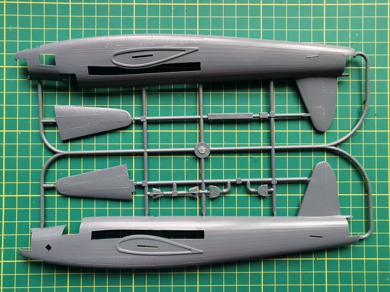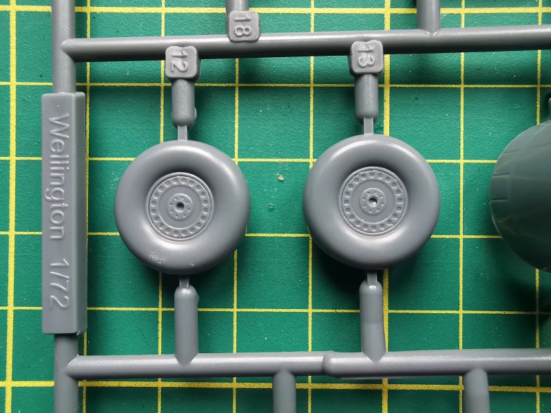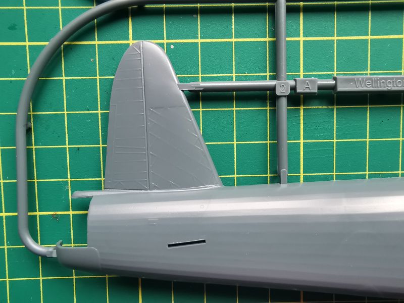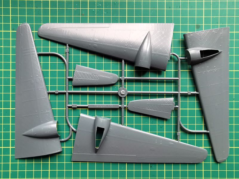 Zestaw składa się z pięciu wyprasek. Pierwsza z nich, „A” to połówki kadłuba oraz dolne części stateczników poziomych. Są też drobne detale silników, ale w tym zestawie ich nie wykorzystamy. Cechą charakterystyczną Wellingtona była oczywiście geodetyczna, kratownicowa konstrukcja płatowca, na której rozpinano poszycie wykonane z płótna. Porównałem uzyskany w zestawie efekt z tym, co można zobaczyć w modelach Airfixa i Trumpetera i doszedłem do wniosku, że Special Hobby znajduje się gdzieś po środku. Wygląda lepiej niż Trumpeter, ale jest mniej finezyjne niż Airfix. Niestety nie znaczono kratownicy w miejscach podłużnych okien po bokach kadłuba, pomimo, że całe wnętrze kadłuba ma taką kratownicę odtworzoną. Trzeba będzie to wykonać we własnym zakresie, bo przez okna jest ona doskonale widoczna. Producent nie przewidział możliwości otwarcia drzwi luków bombowych.