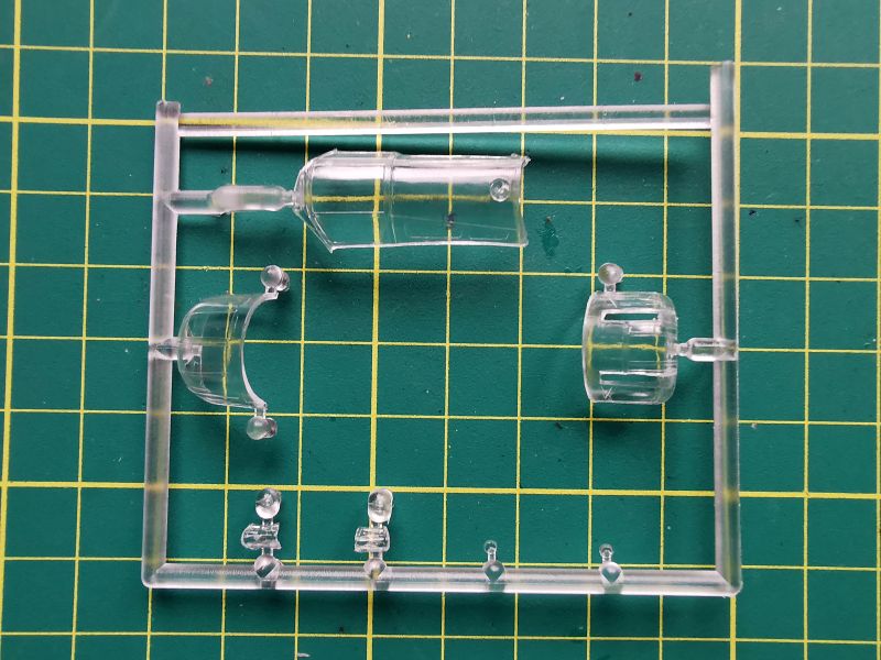 Zupełnie inna jest także wypraska zawierająca elementy przezroczyste. Z tych samych przyczyn co kadłub. Znajdziemy tu nie dzielona osłonę kabiny, składającą się z dwóch części wieżyczkę strzelecką oraz kilka drobnych elementów. Zarówno osłonie kabiny, jak i samej wieżyczce dobrze zrobi jakaś drobna polerka.