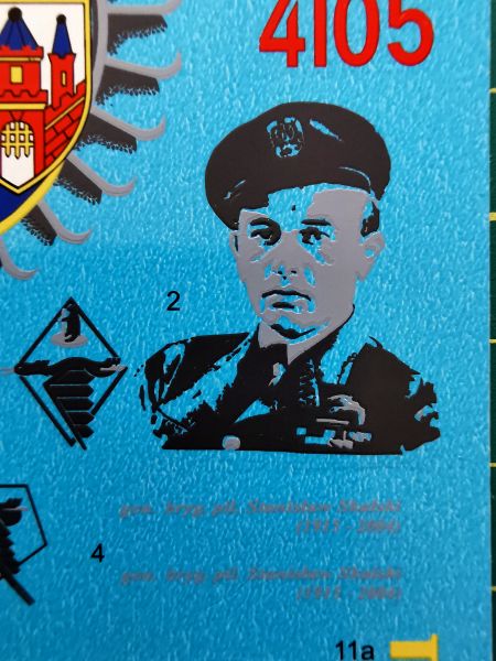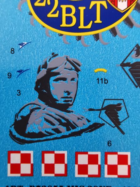 Ponieważ kalkomanie umożliwiające wykonanie modelu MiGa-29 UB w malowaniu poświęconym Stanisławowi Skalskiemu od pewnego czasu wchodzą w skład oferty firmy ModelMaker, nie trudno się było domyślać, że wejdą one w skład tego zestawu. Jako osobny produkt mają one numer katalogowy D72055, zaś znajdziemy na nich szachownice, numery, godła oraz co najważniejsze – emblematy okolicznościowe znajdujące się na usterzeniu i grzbiecie kadłuba. W tym miejscu trzeba zwrócić uwagę na elementy oznaczone jako 10, 11a i 11b. W schemacie malowania nie ma informacji, w jaki sposób należy je użyć. Są one uzupełnieniem godła na grzbiet kadłuba, w miejscu gdzie znajduje się chwyt powietrza do jednego z układów samolotu. Jest to element G7. Aby nakleić te kalkomanie prawidłowo, warto odwiedzić stronę producenta i zajrzeć do instrukcji zestawu D72055, tam jest to pokazane, a tu, jak widać zadziałały prawa Murphiego. Dlatego zachęcam do odwiedzenia strony.