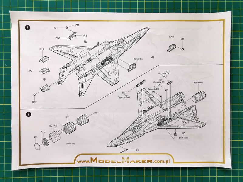Instrukcja montażu i malowania została opracowana w sposób analogony, jak zestawy kalkomanii oferowane przez kołobrzeskiego producenta. Są to kolorowe wydruki w formacie A4. Na stronie tytułowej znajdziemy notatkę z której możemy dowiedzieć się nieco o samym samolocie, jak i o zestawie. Jej treść zredagowano po polsku i po angielsku. Rysunki montażowe pochodzą w oryginalnego zestawu Trumpetera, na nowo, z uwzględnieniem zmian opracowano jedynie rozpiskę wartości pudełka. Na ostatnich stronach instrukcji znajdują się oczywiście schematy malowania i nałożenia kalkomanii. Przy czym ogólny schemat liczy dwie strony, schemat nakładania stencili aż sześć, z czego jedna to napisy na belki oraz podwieszenia. Te ostatnie to podkadłubowy zbiornik paliwa, oraz szkolne kierowane pociski rakietowe UZR-60. Czy ten akurat MiG-29 UB przenosił także inne uzbrojenie, tego nie wiem, trzeba po prostu poszukać zdjęć lub informacji na ten temat.