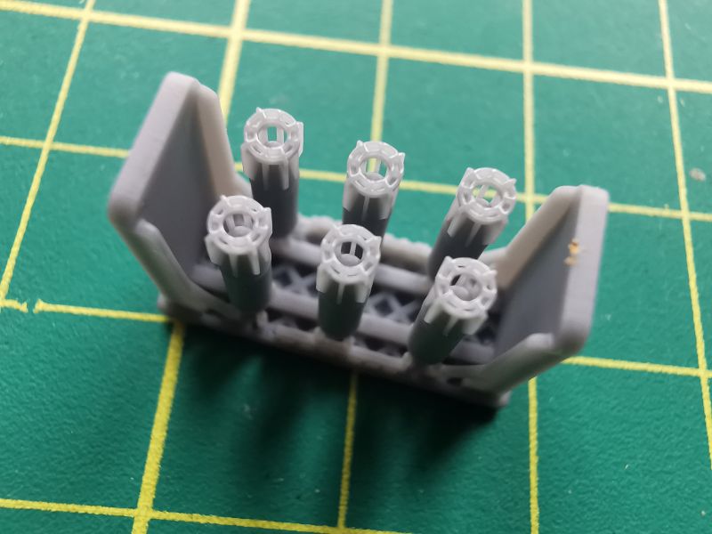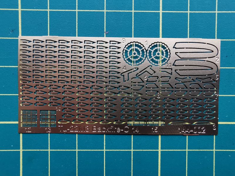 Uzupełnieniem elementów wykonanych z polistyrenu jest fototrawiona blaszka oraz wydruki 3D. Jedynie wyloty dysz silników są identyczne jak w poprzedniej wersji. Tutaj fototrawioną blaszkę opracowano na nowo z uwzględnieniem wszystkich drobnych detali jakimi różniły się obie wersje Tu-22M. Bardzo dobrym pomysłem było natomiast wykonanie bomb FAB-250 w formie wydruków 3D. Do zestawu dołączono trzy wydruki, zaś na każdym znajduje się po sześć gotowych do dalszej pracy bomb. Odpada żmudne przyklejanie do każdej bomby fototrawionych stabilizatorów. Tym bardziej, że ten właśnie wariant uzbrojenia z bombami na belkach wielozamkowych jest równie atrakcyjne, jak te z pociskami manewrującymi.