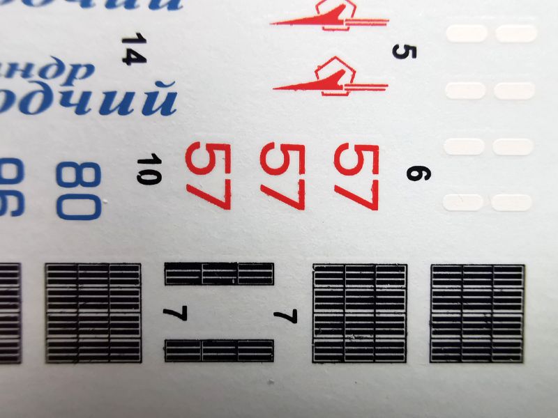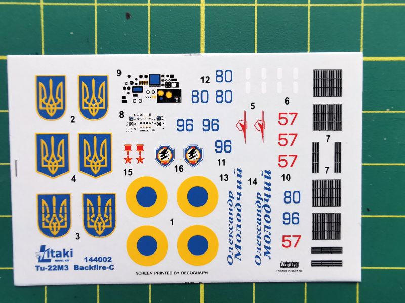 W omawianym zestawie, podobnie jak w przypadku modelu Tu-22M3, kalkomania także składa się dwóch arkusików. Mniejszego, na którym znajdziemy panele do naklejenia na grzebiecie kadłuba. Pominąłem go jednak, bo jest identyczny, jak w poprzedniej wersji. Większy arkusik przygotowano już na potrzeby tego zestawu. Zawiera on oznaczenia, godła ale także wyposażenie kokpitu i kratki do umieszczenia na wlotach powietrza. Jakość wykonania kalkomanii jest identyczna, jak poprzednich modelach tego producenta, czyli bardzo dobra. Nie jest to czcza propaganda, pracowałem z tymi kalkami przy klejeniu modelu J-22 ORAO.