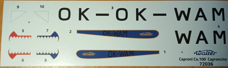 Producent modelu dysponuje zdjęciami samolotu Ca.100 Walter, na których widać oznaczenia kodowe OK-WAM. zarówno na kadłubie, jak i na skrzydłach. Kalkomanie do modelu zostały wykonane zgodnie z tym co widać na tych zdjęciach.