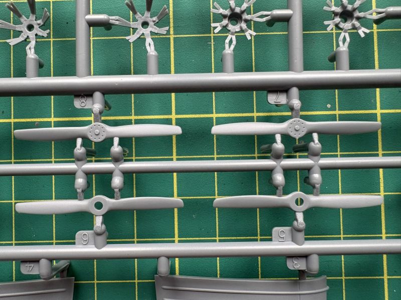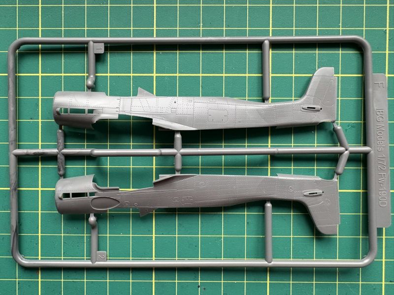 Różnice w stosunku do poprzednich zestawów są oczywiste, bo ograniczają się do innego kształtu statecznika pionowego. W tym celu w opisywanym zestawie znajdziemy wypraskę oznaczoną jako „F”. Rozmieszczono na niej na nowo opracowane połówki kadłuba z szerokim statecznikiem, do którego po sklejeniu kadłuba dokleimy standardowy ster kierunku. Pozostałe wypraski zestawu wchodziły w skład poprzednio wydanych modeli niemieckiego myśliwca. Podobnie ma się sprawa blaszki fototrawionej i kalkomanii z napisami eksploatacyjnymi.
