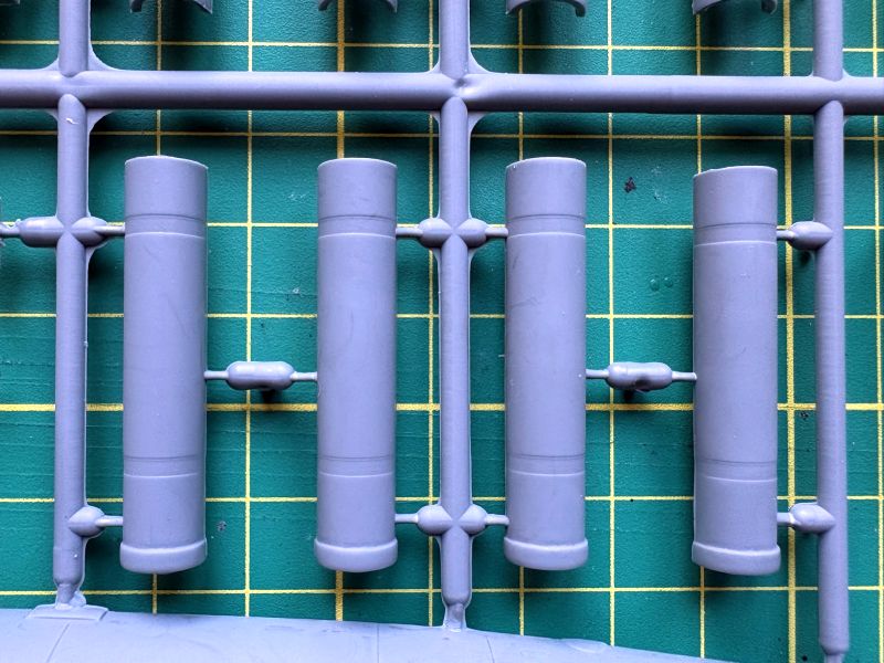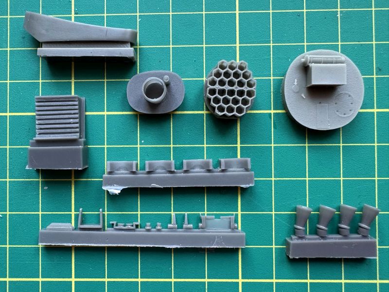O zastosowanej technologii przypominają także dołączone do zestawu dodatki w postaci fototrawionej blaszki oraz kilku odlewów wykonanych z ciemnoszarej żywicy. Na blaszce znajdziemy pasy pilota, celownik, mocowanie silników startowych a także całkiem ładne tabliczki z nazwą modelu i skalą. W formie odlewów żywicznych wykonano natomiast wyrzutnię rakiet, dysze wszystkich silników oraz sporo drobiazgów, które zastosujemy zarówno w kokpicie jak i na zewnątrz.